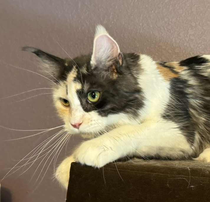 Willow is a CFA and TICA registered black silver shaded torbie with white Maine Coon queen from Noble Manes cattery of LA.