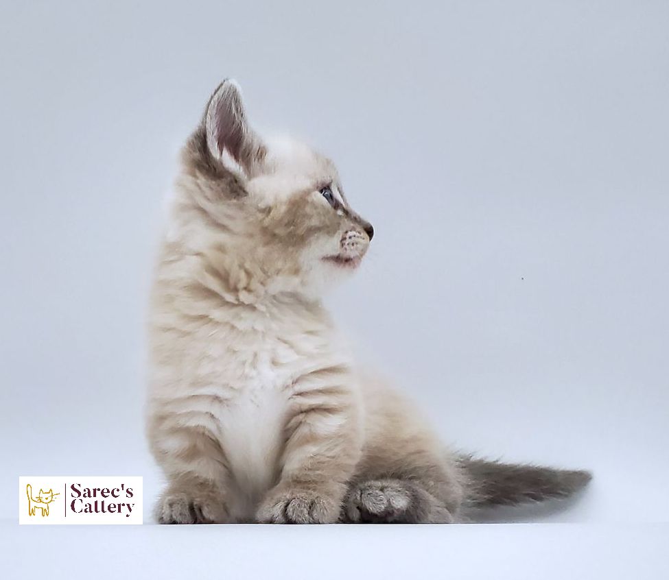 Earl is a blue-eyed pointed male American Curl kitten (non-munchkin), which means he has "regular length" legs.