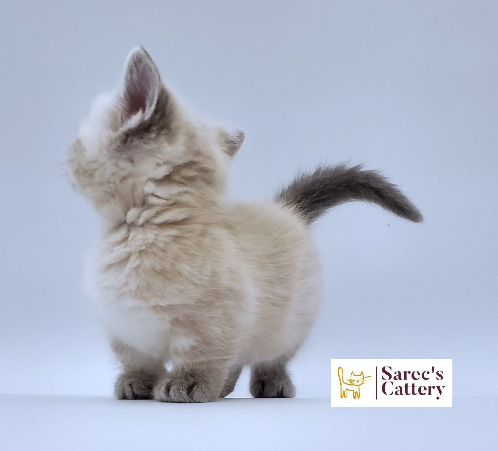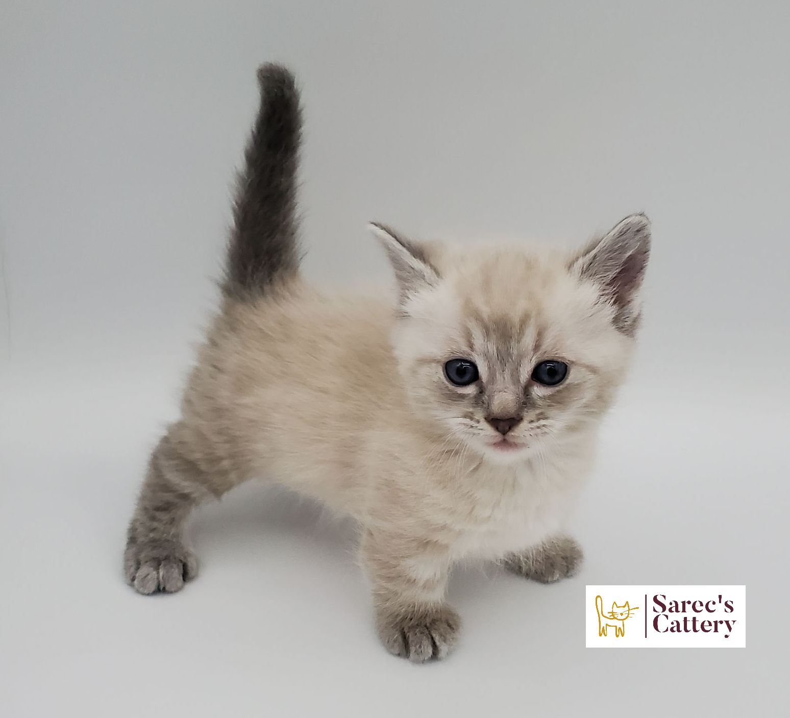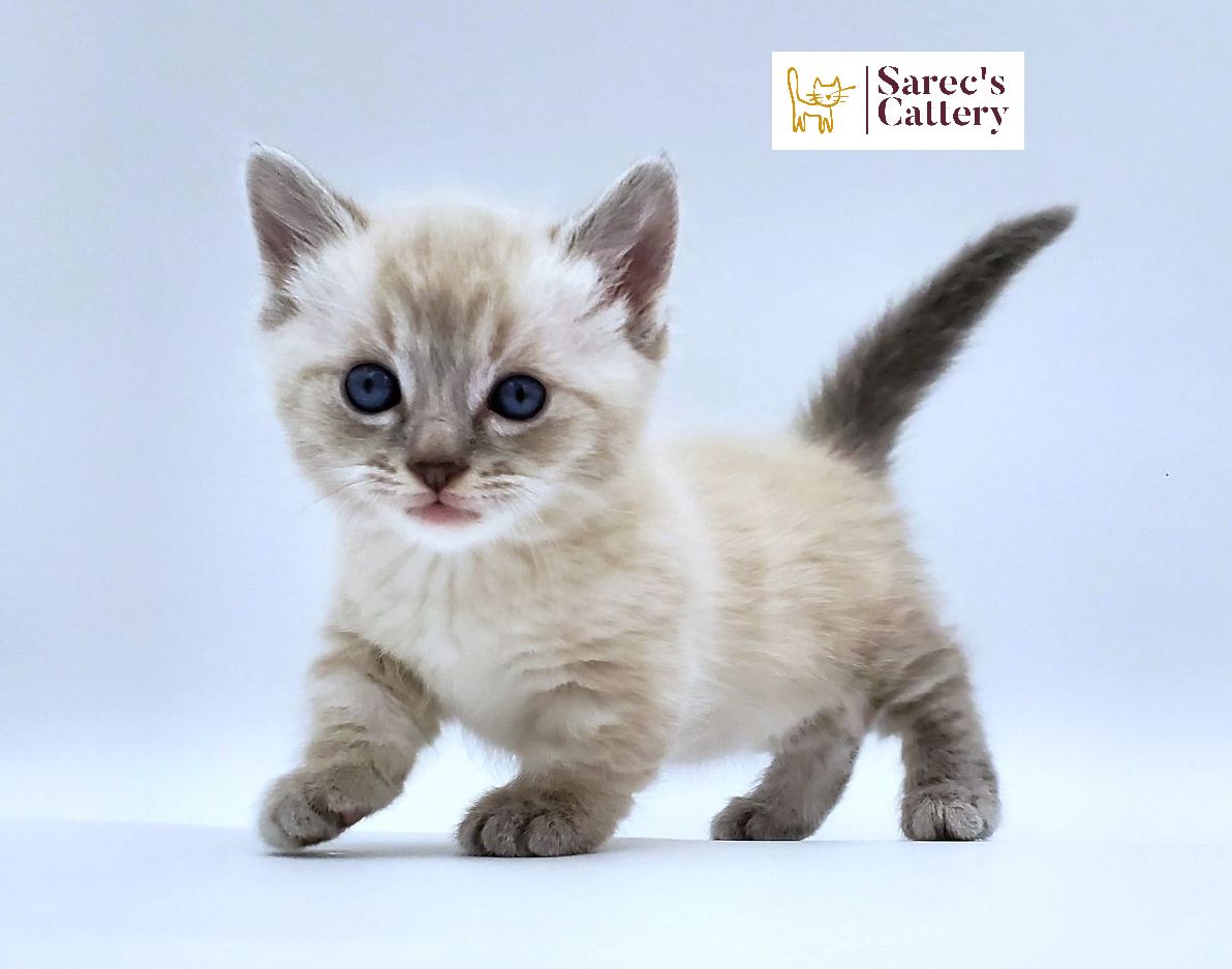 Emmett is a blue-eyed pointed Kinkalow Munchkin, which means he has "short munchkin-length" legs.