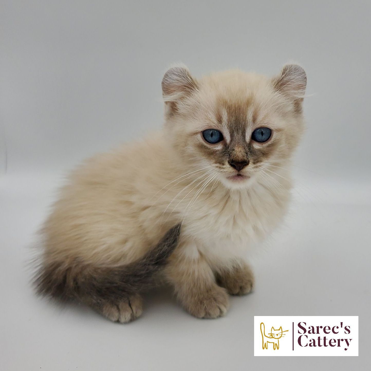 Merrick is a blue-pointed American Curl (regular-length legged) son from Shiloh and Boris's October 2024 Litter.